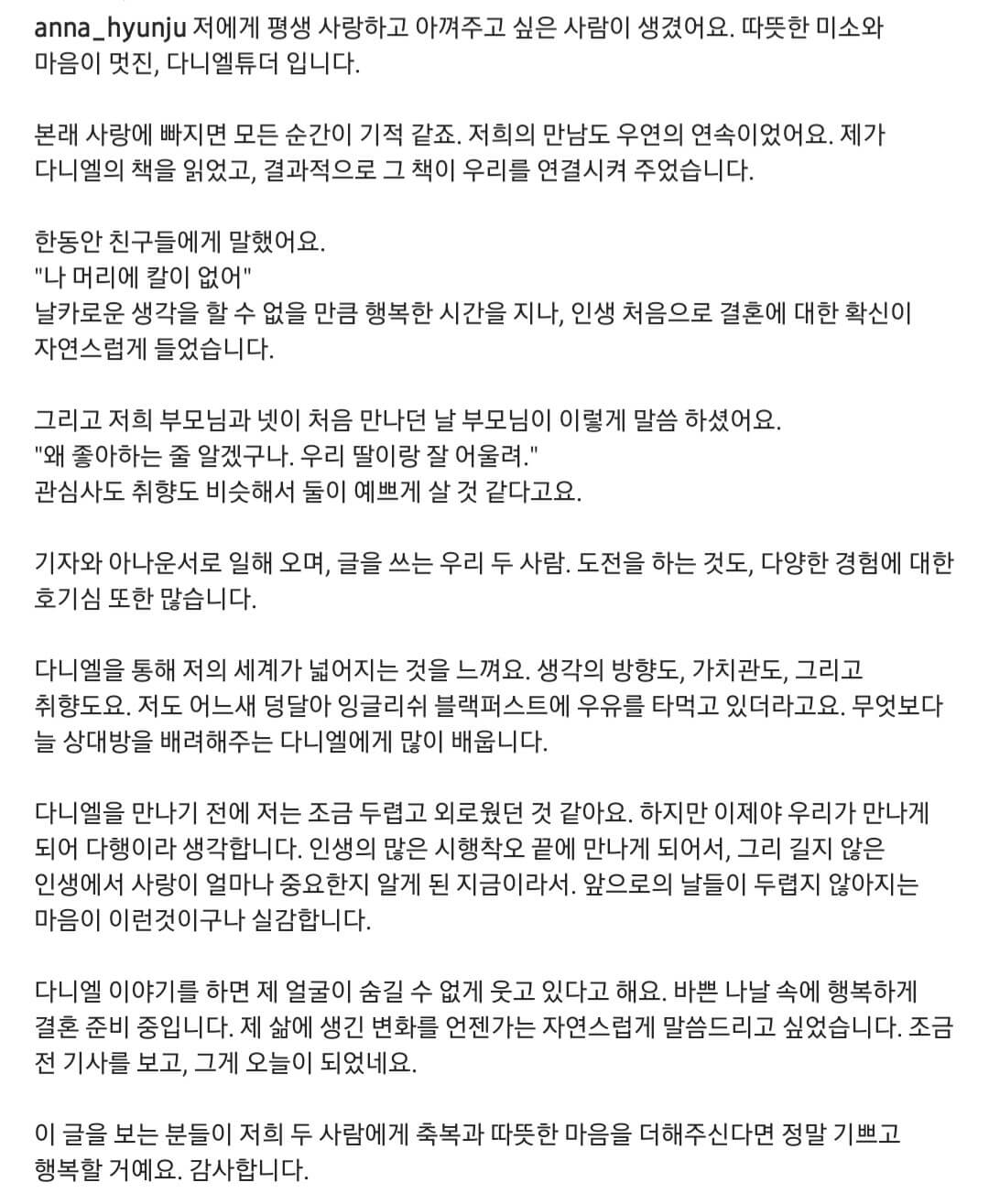 다음은 임현주 아나운서가 인스타그램에 기재한 결혼 발표 전문이다.